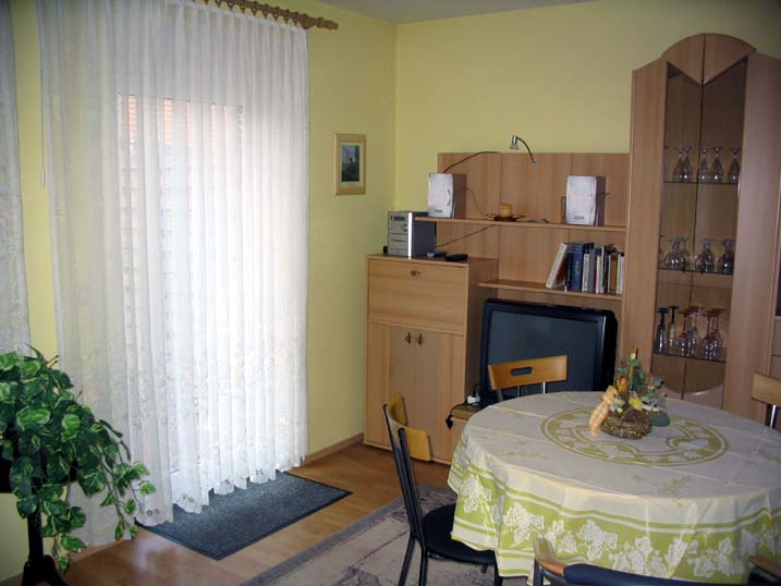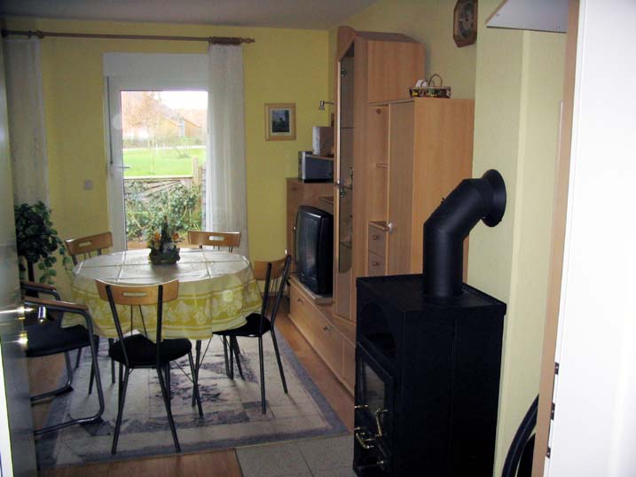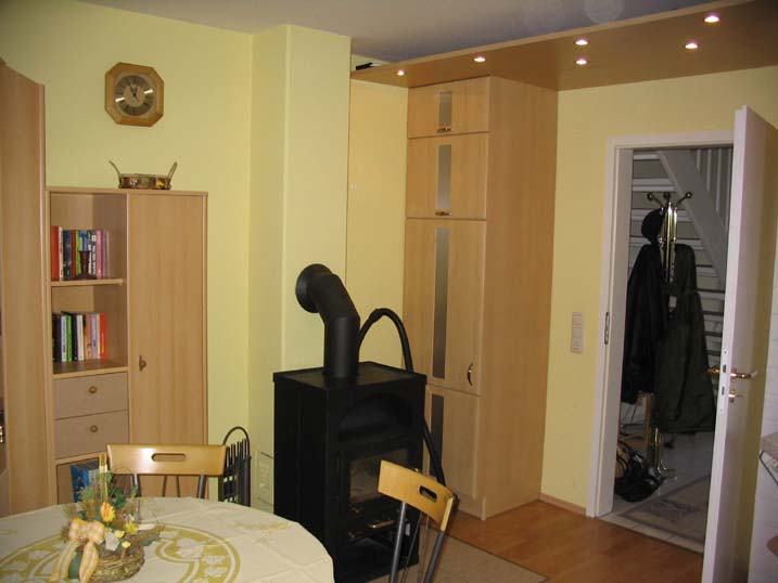 Eßecke, Terrassentür, Schrankwand und Kaminofen